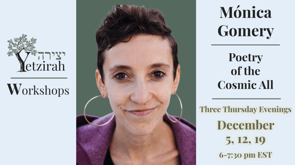 Mónica Gomery is a writer and rabbi. Her second poetry collection, Might Kindred, won the Prairie Schooner Raz-Shumaker Book Prize and was published by the University of Nebraska Press in 2022. She is also the author of the poetry collection Here is the Night and the Night on the Road (Cooper Dillon Books, 2018), and the chapbook Of Darkness and Tumbling (YesYes Books, 2017). Her poems have been awarded the Stanley Kunitz Memorial Prize and the Sappho Prize for Women Poets, and have been featured on Ours Poetica and The Slowdown podcast. Recent poems appear in The Kenyon Review, Poetry Northwest, The Massachusetts Review, and West Branch, among other journals. Mónica was ordained by Hebrew College in 2017 and serves as Rabbi and Music Director at Kol Tzedek Synagogue in Philadelphia. Visit Mónica’s profile in our Discover Jewish Poets database.